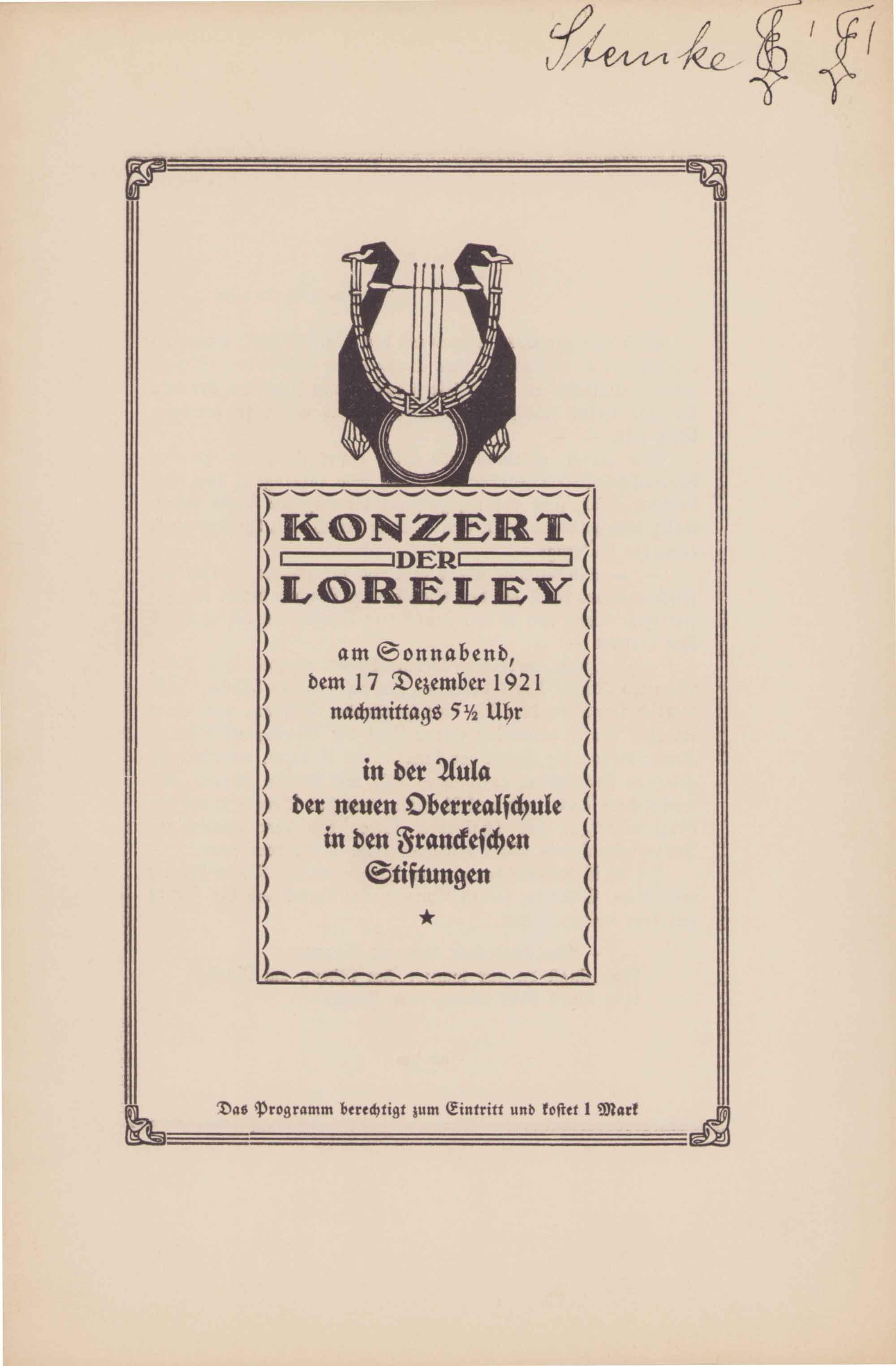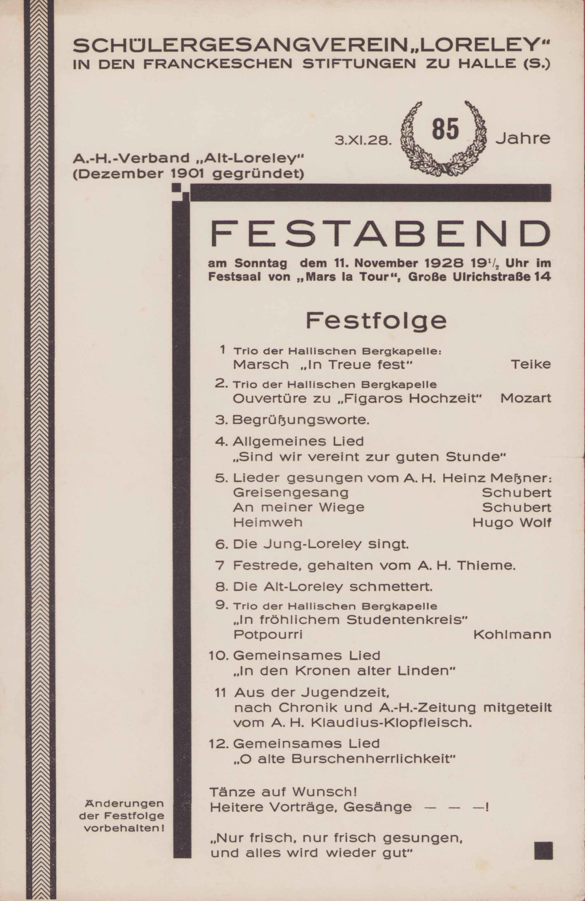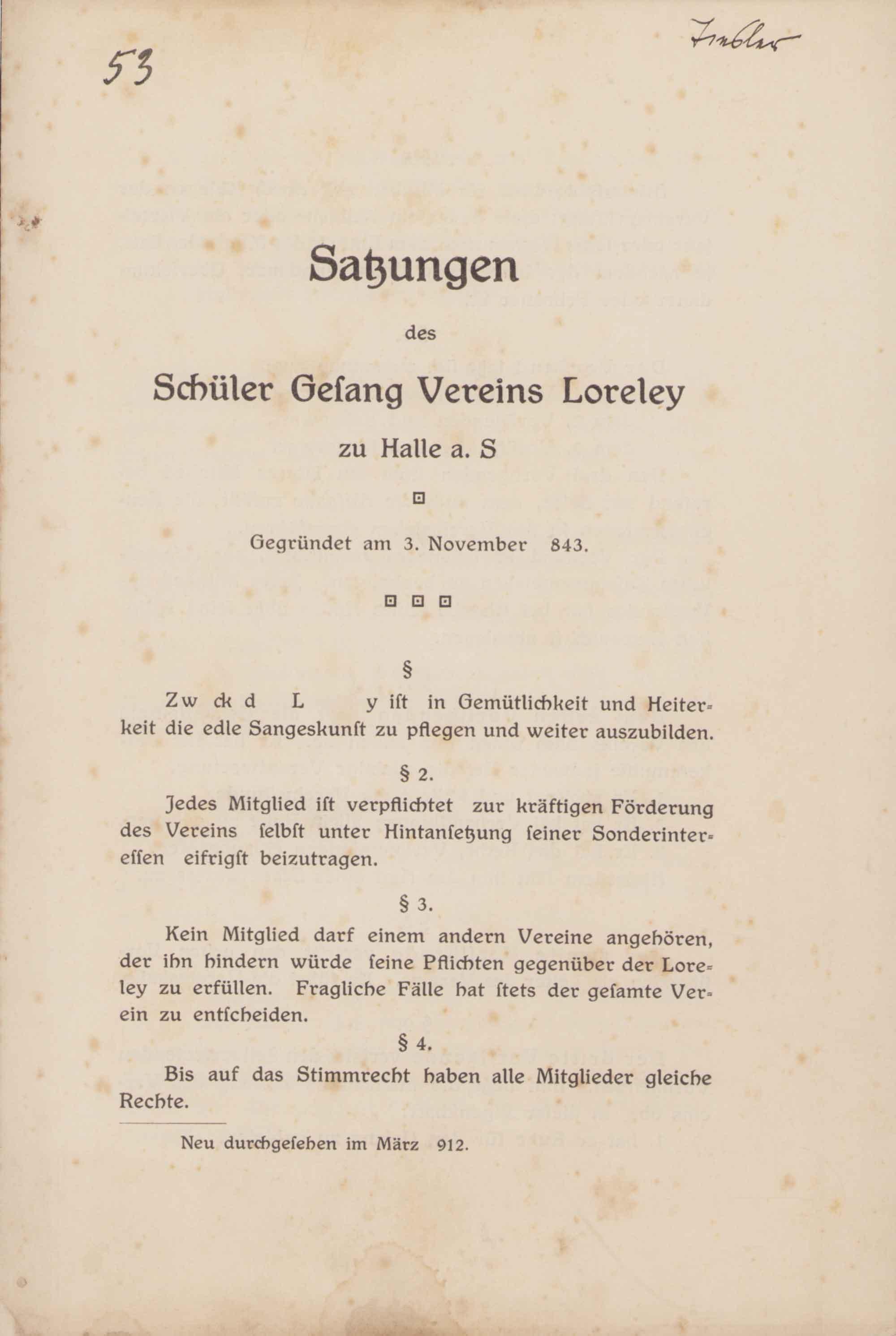 Alt-Loreley. Mitteilungen des Verbandes ehemaliger Lorelisten. 30. Sonderheft anlässlich des 90. Gründungsjubiläums des Schülergesangvereins. Halle, 1933