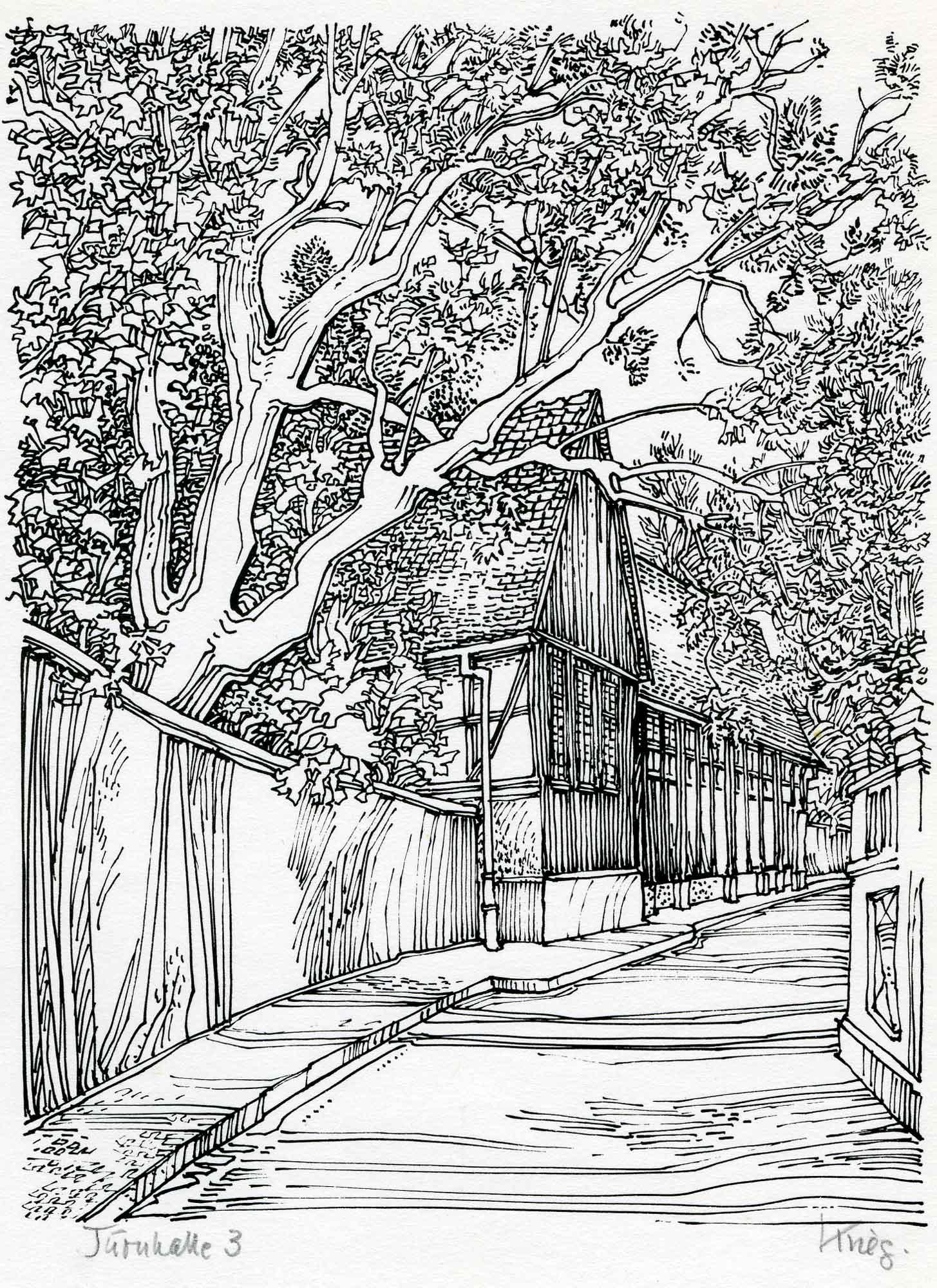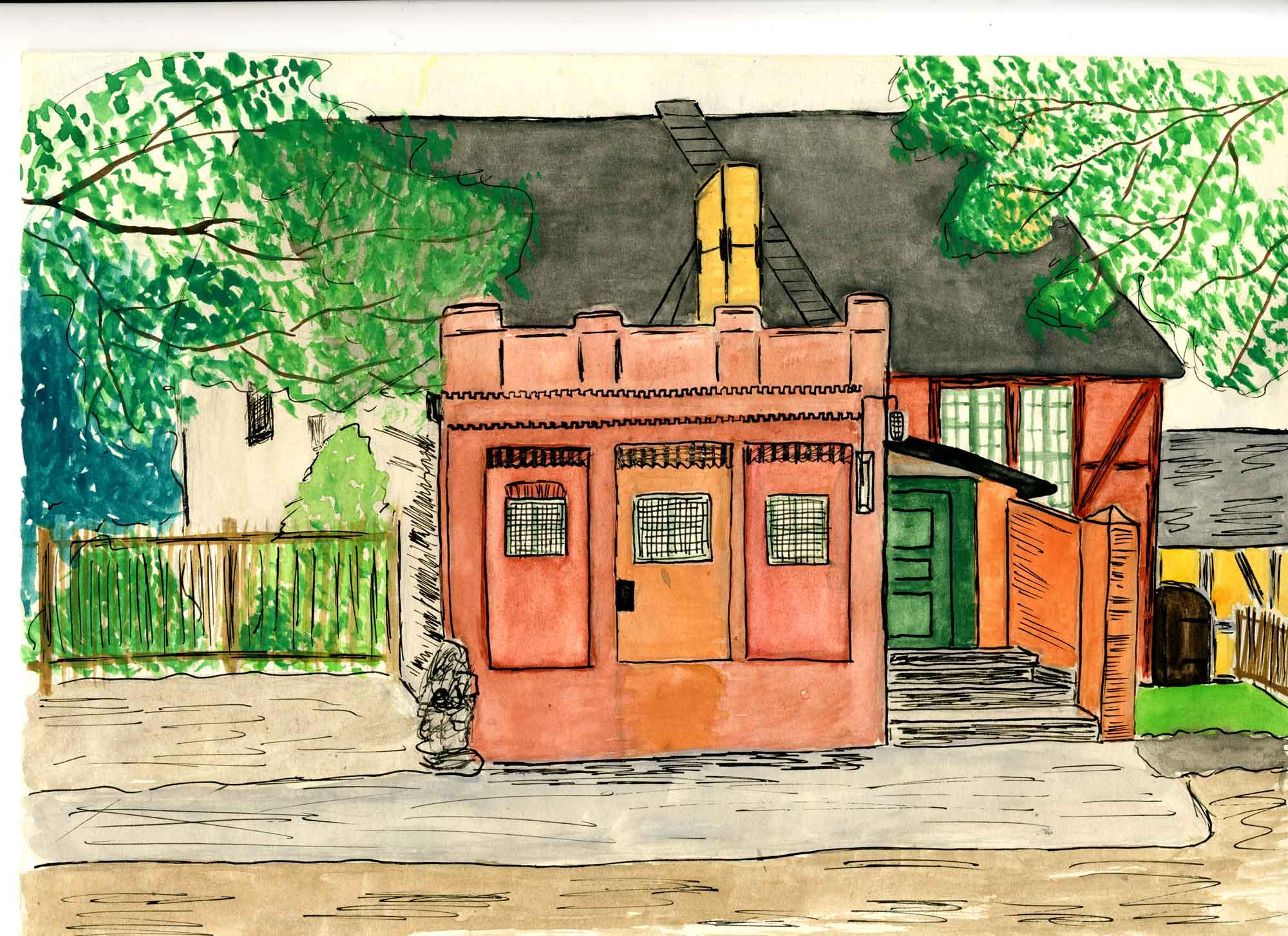 Der »Kuhstall«. Zeichnung von Elke Wiegand aus dem Kunstunterricht der EOS August Hermann Francke, Halle, 1960