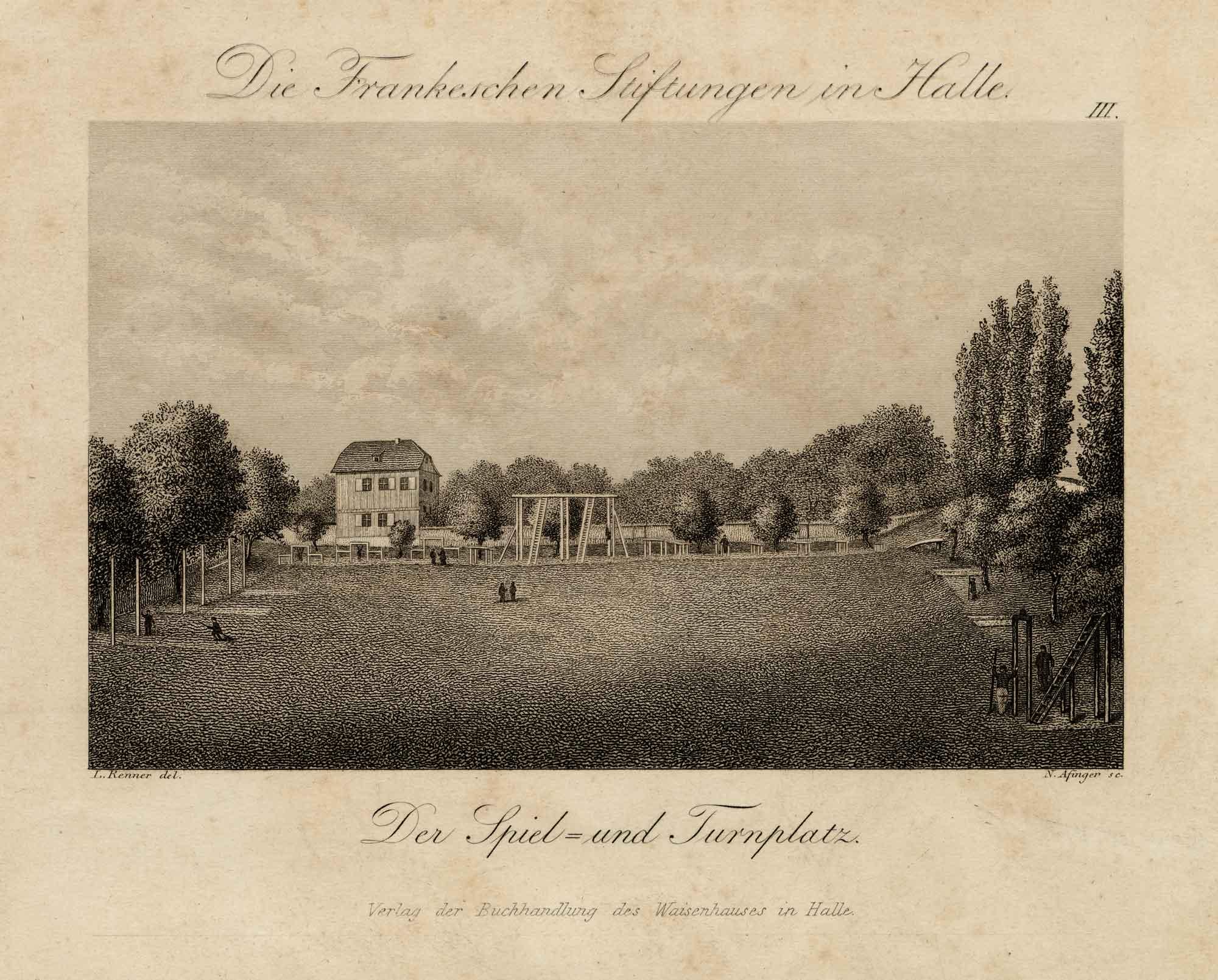 Der Spiel- und Sportplatz der Franckeschen Stiftungen. Stahlstich von Nikolaus Afinger, um 1850